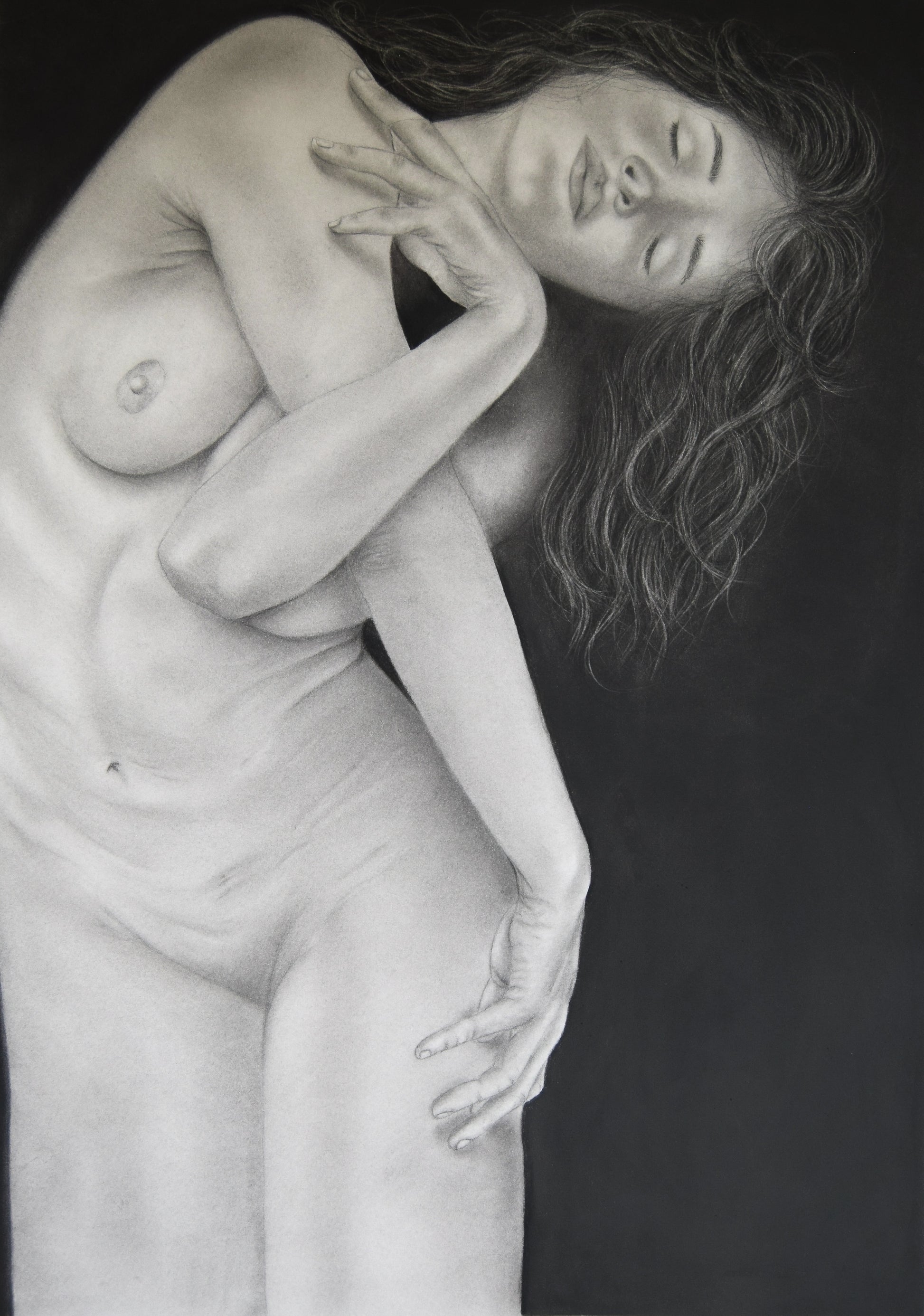 In this drawing, a moment of intimate vulnerability and self-embrace is captured, where the model leans on herself as both refuge and strength. Her closed eyes and serene expression suggest a deep surrender to inner peace, symbolizing resilience, self-love, and the quiet power of solitude. “Lean on me, My soul” speaks to the idea that, in the end, we are our own sanctuary.
