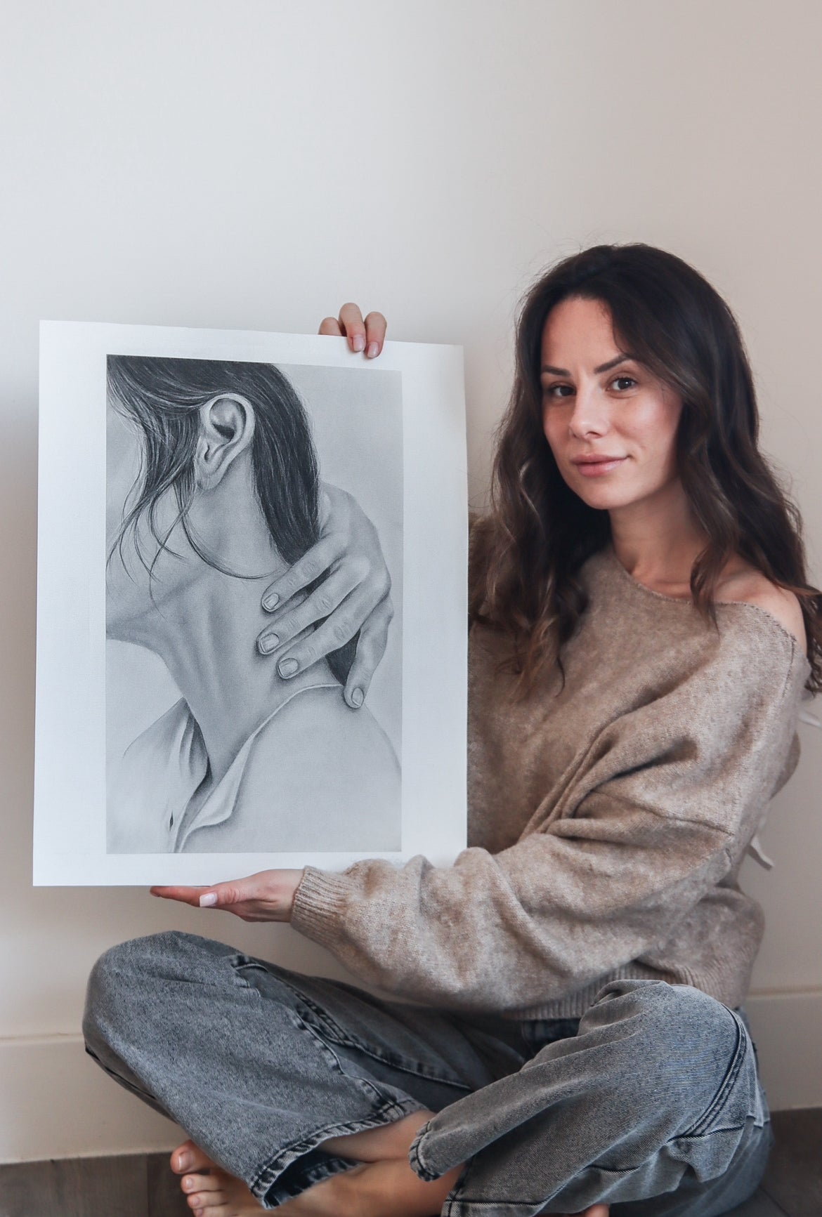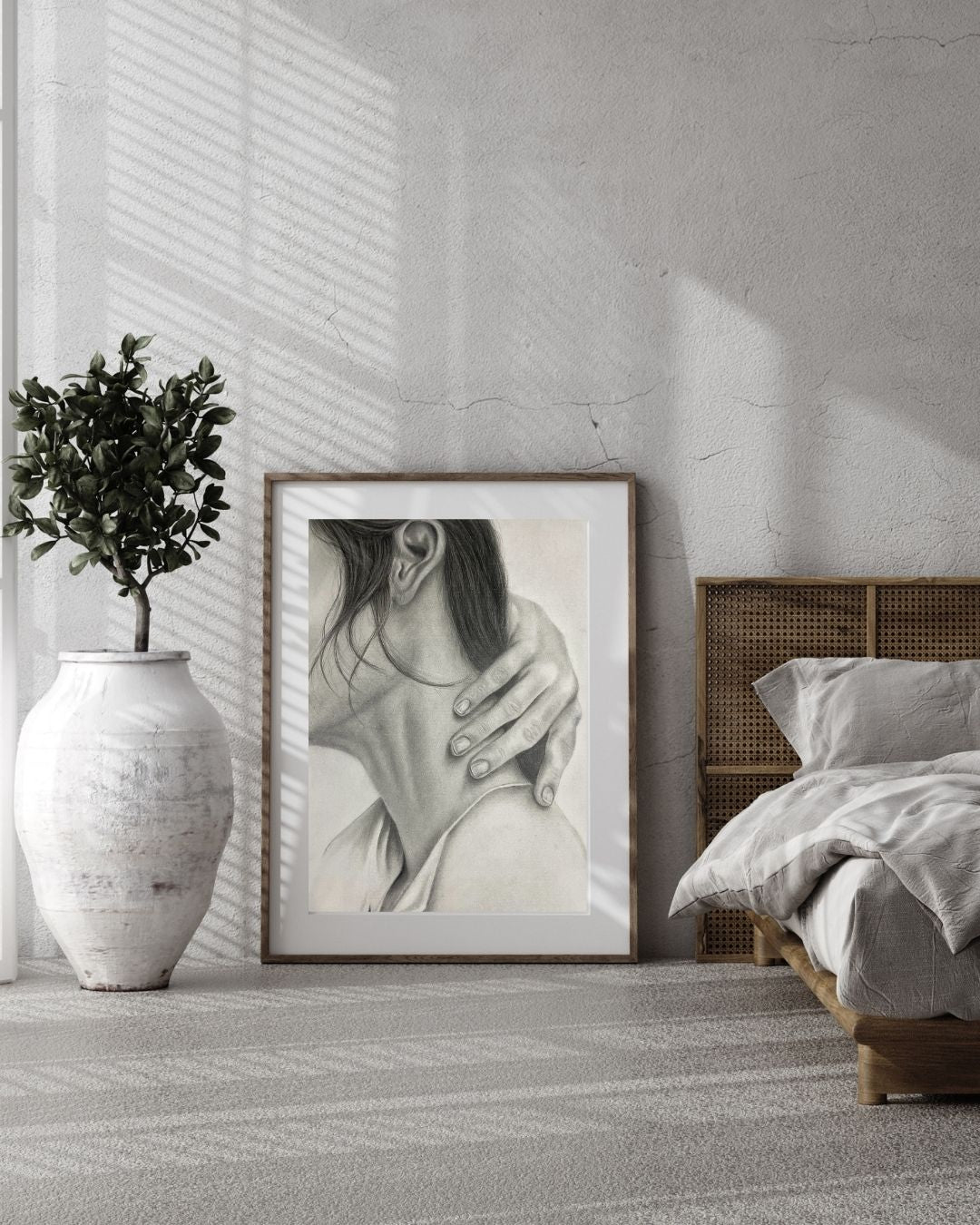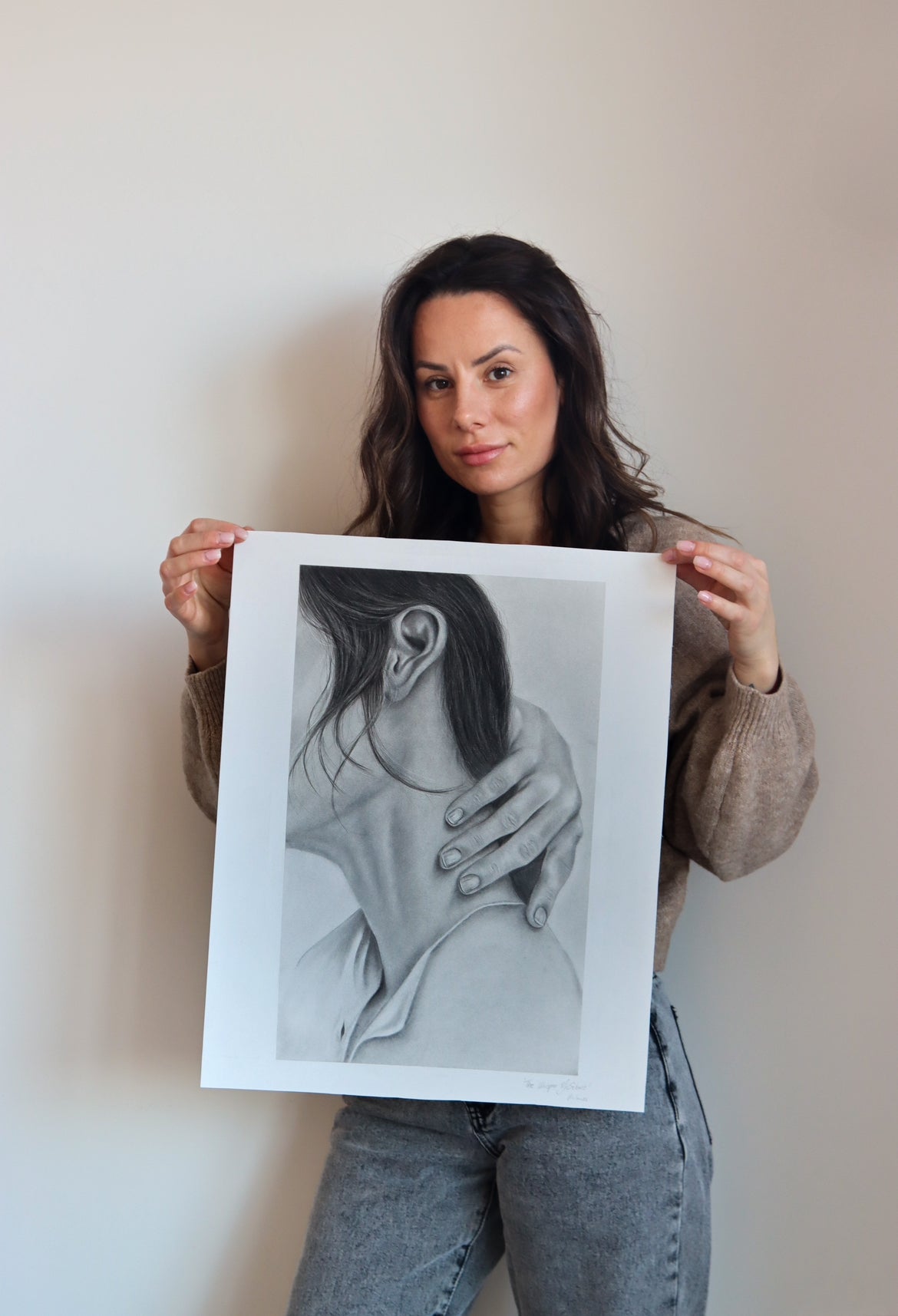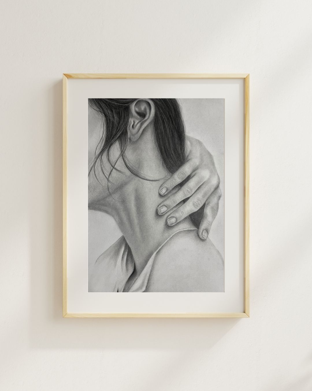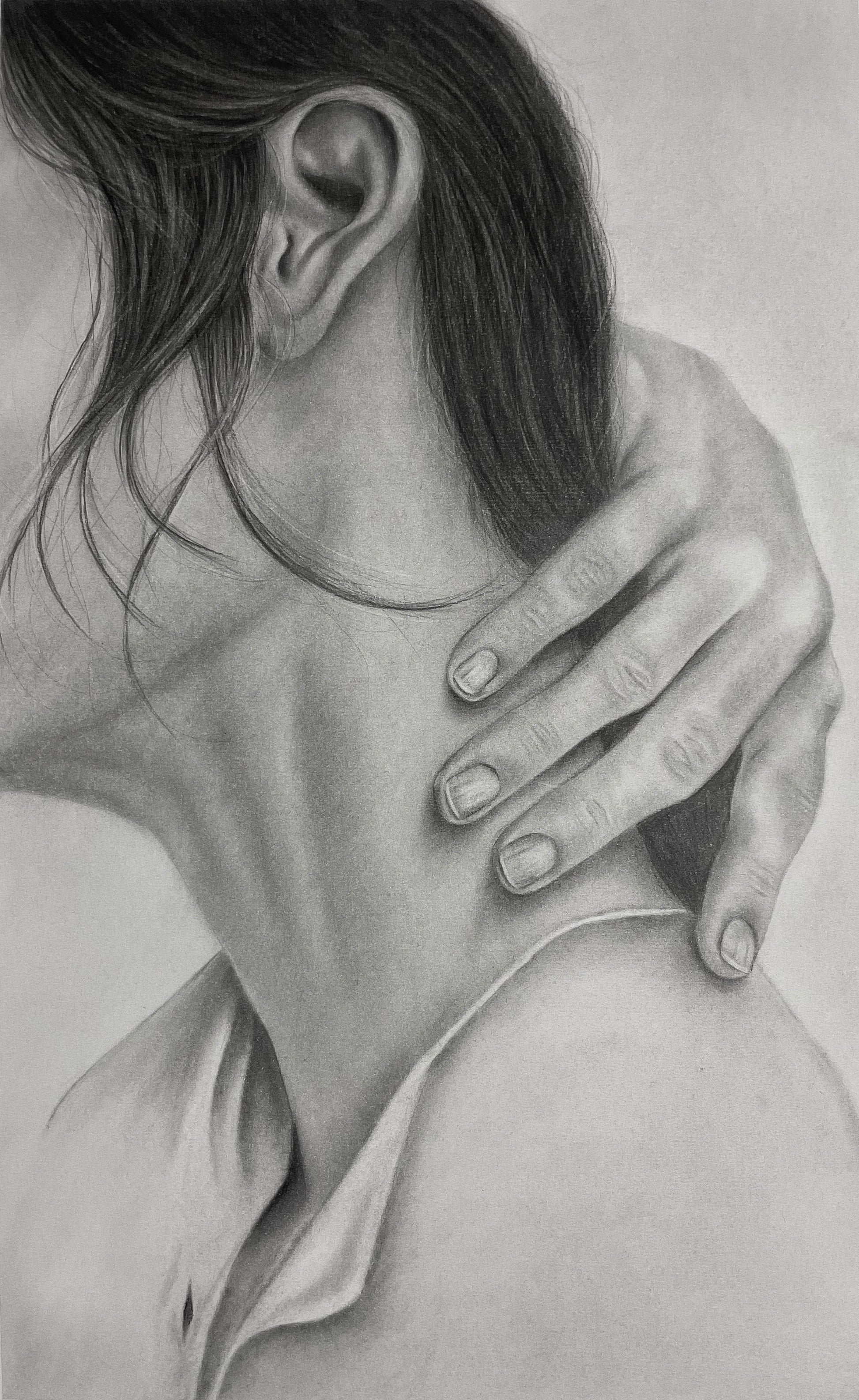 This drawing reflects the intimate stillness and emotional depth conveyed through the delicate details of the neck, ear, and hand. The composition invites exploration of themes such as vulnerability, connection, and unspoken emotions. These subtle elements the neck, ear, and hand, become a visual language that speaks to both the fragility and strength of the human form, suggesting the quiet spaces where words are unnecessary, yet deeply felt. The whisper is not in words but in touch, in the way the fingers press gently against the neck, as if holding onto something fleeting yet deeply felt."The Whisper of Silence" evokes a profound stillness, a moment suspended between intimacy and solitude. The delicate rendering of skin, the soft tension in the hand, and the unseen face suggest a quiet dialogue perhaps between past and present, longing and acceptance.